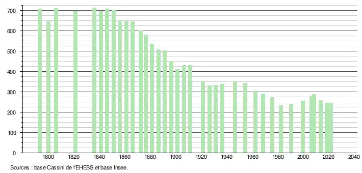 - Population municipale légale en vigueur au 1er janvier 2024, millésimée 2021, définie dans les limites territoriales en vigueur au 1er janvier 2023, date de référence statistique : 1er janvier 2021.