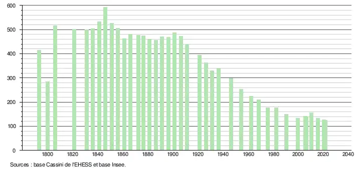 L'évolution du nombre d'habitants est connue à travers les recensements de la population effectués dans la commune depuis 1793. Pour les communes de moins de 10 000 habitants, une enquête de recensement portant sur toute la population est réalisée tous les cinq ans, les populations légales des années intermédiaires étant quant à elles estimées par interpolation ou extrapolation[32]. Pour la commune, le premier recensement exhaustif entrant dans le cadre du nouveau dispositif a été réalisé en 2005[33].