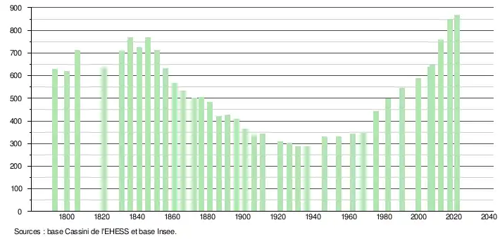 L'évolution du nombre d'habitants est connue à travers les recensements de la population effectués dans la commune depuis 1793. Pour les communes de moins de 10 000 habitants, une enquête de recensement portant sur toute la population est réalisée tous les cinq ans, les populations légales des années intermédiaires étant quant à elles estimées par interpolation ou extrapolation[22]. Pour la commune, le premier recensement exhaustif entrant dans le cadre du nouveau dispositif a été réalisé en 2007[23].