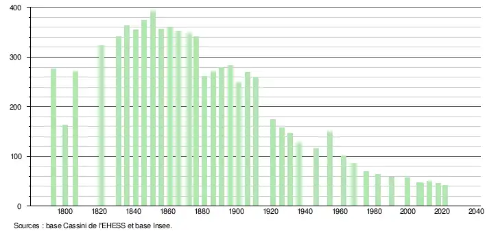 L'évolution du nombre d'habitants est connue à travers les recensements de la population effectués dans la commune depuis 1793. Pour les communes de moins de 10 000 habitants, une enquête de recensement portant sur toute la population est réalisée tous les cinq ans, les populations légales des années intermédiaires étant quant à elles estimées par interpolation ou extrapolation[38]. Pour la commune, le premier recensement exhaustif entrant dans le cadre du nouveau dispositif a été réalisé en 2007[39].