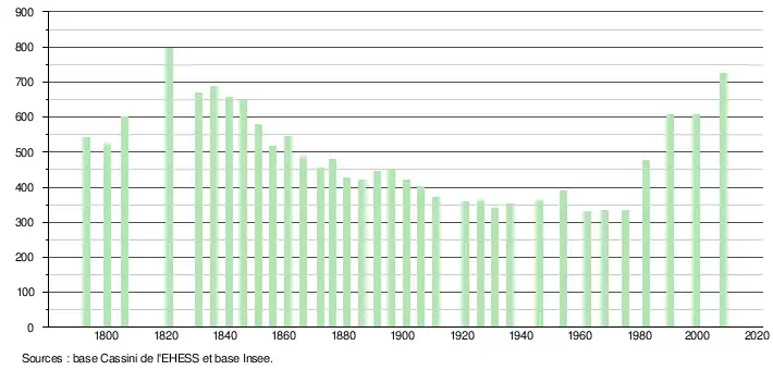 L'évolution du nombre d'habitants est connue à travers les recensements de la population effectués dans la commune depuis 1793. À partir du , les populations légales des communes sont publiées annuellement dans le cadre d'un recensement qui repose désormais sur une collecte d'information annuelle, concernant successivement tous les territoires communaux au cours d'une période de cinq ans. Pour les communes de moins de 10 000 habitants, une enquête de recensement portant sur toute la population est réalisée tous les cinq ans, les populations légales des années intermédiaires étant quant à elles estimées par interpolation ou extrapolation[11]. Pour la commune, le premier recensement exhaustif entrant dans le cadre du nouveau dispositif a été réalisé en 2008[12],[Note 2].