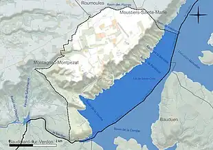 La commune est limitée au sud-est par le lac de Sainte-Croix, une retenue artificielle de 767 millions de m³, mise en eau par Électricité de France (EDF) en 1973, à la suite de la construction du barrage de Sainte-Croix, sur le cours du Verdon[4],[5].