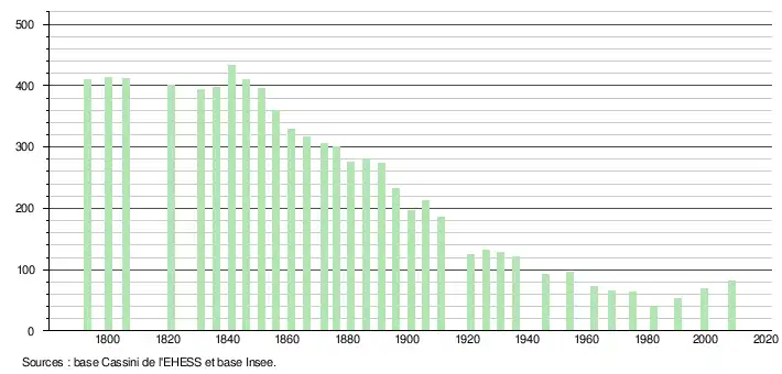 L'évolution du nombre d'habitants est connue à travers les recensements de la population effectués dans la commune depuis 1793. À partir du , les populations légales des communes sont publiées annuellement dans le cadre d'un recensement qui repose désormais sur une collecte d'information annuelle, concernant successivement tous les territoires communaux au cours d'une période de cinq ans. Pour les communes de moins de 10 000 habitants, une enquête de recensement portant sur toute la population est réalisée tous les cinq ans, les populations légales des années intermédiaires étant quant à elles estimées par interpolation ou extrapolation[9]. Pour la commune, le premier recensement exhaustif entrant dans le cadre du nouveau dispositif a été réalisé en 2008[10],[Note 1].