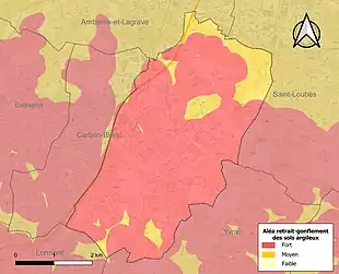 Le retrait-gonflement des sols argileux est susceptible d'engendrer des dommages importants aux bâtiments en cas d’alternance de périodes de sécheresse et de pluie. La totalité de la commune est en aléa moyen ou fort (67,4 % au niveau départemental et 48,5 % au niveau national). Sur les 1 823 bâtiments dénombrés sur la commune en 2019, 1 823 sont en aléa moyen ou fort, soit 100 %, à comparer aux 84 % au niveau départemental et 54 % au niveau national. Une cartographie de l'exposition du territoire national au retrait gonflement des sols argileux est disponible sur le site du BRGM[23],[Carte 2].
