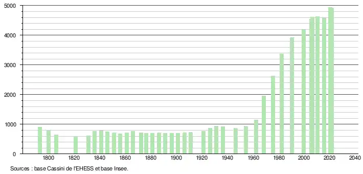 L'évolution du nombre d'habitants est connue à travers les recensements de la population effectués dans la commune depuis 1793. Pour les communes de moins de 10 000 habitants, une enquête de recensement portant sur toute la population est réalisée tous les cinq ans, les populations légales des années intermédiaires étant quant à elles estimées par interpolation ou extrapolation[28]. Pour la commune, le premier recensement exhaustif entrant dans le cadre du nouveau dispositif a été réalisé en 2005[29].
