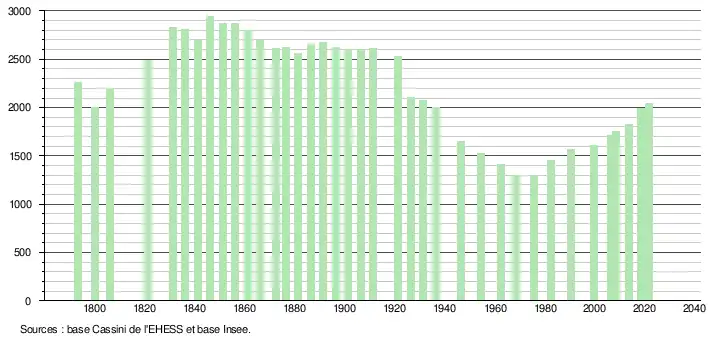 L'évolution du nombre d'habitants est connue à travers les recensements de la population effectués dans la commune depuis 1793. Pour les communes de moins de 10 000 habitants, une enquête de recensement portant sur toute la population est réalisée tous les cinq ans, les populations légales des années intermédiaires étant quant à elles estimées par interpolation ou extrapolation[28]. Pour la commune, le premier recensement exhaustif entrant dans le cadre du nouveau dispositif a été réalisé en 2008[29].