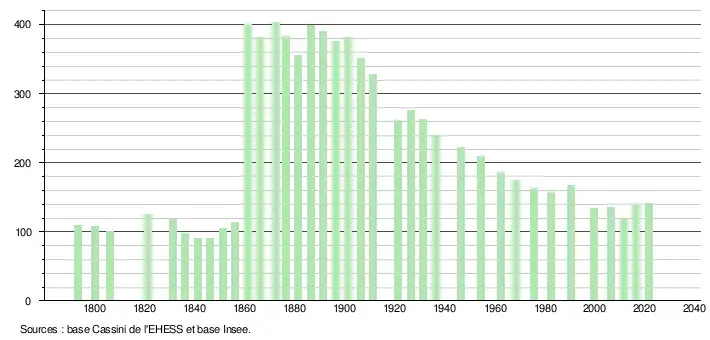 L'évolution du nombre d'habitants est connue à travers les recensements de la population effectués dans la commune depuis 1793. Pour les communes de moins de 10 000 habitants, une enquête de recensement portant sur toute la population est réalisée tous les cinq ans, les populations légales des années intermédiaires étant quant à elles estimées par interpolation ou extrapolation[21]. Pour la commune, le premier recensement exhaustif entrant dans le cadre du nouveau dispositif a été réalisé en 2006[22].