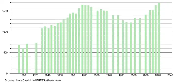 L'évolution du nombre d'habitants est connue à travers les recensements de la population effectués dans la commune depuis 1793. Pour les communes de moins de 10 000 habitants, une enquête de recensement portant sur toute la population est réalisée tous les cinq ans, les populations légales des années intermédiaires étant quant à elles estimées par interpolation ou extrapolation[50]. Pour la commune, le premier recensement exhaustif entrant dans le cadre du nouveau dispositif a été réalisé en 2006[51].