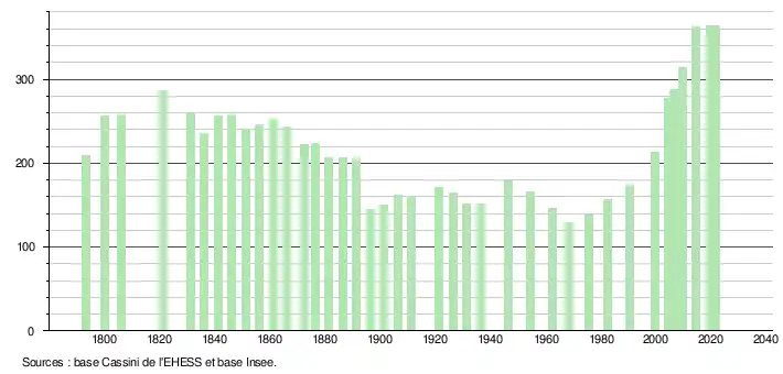 L'évolution du nombre d'habitants est connue à travers les recensements de la population effectués dans la commune depuis 1793. Pour les communes de moins de 10 000 habitants, une enquête de recensement portant sur toute la population est réalisée tous les cinq ans, les populations légales des années intermédiaires étant quant à elles estimées par interpolation ou extrapolation[23]. Pour la commune, le premier recensement exhaustif entrant dans le cadre du nouveau dispositif a été réalisé en 2004[24].