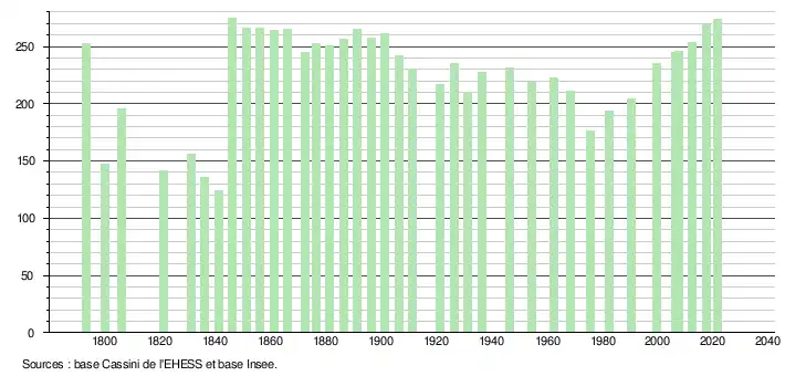 L'évolution du nombre d'habitants est connue à travers les recensements de la population effectués dans la commune depuis 1793. Pour les communes de moins de 10 000 habitants, une enquête de recensement portant sur toute la population est réalisée tous les cinq ans, les populations légales des années intermédiaires étant quant à elles estimées par interpolation ou extrapolation[22]. Pour la commune, le premier recensement exhaustif entrant dans le cadre du nouveau dispositif a été réalisé en 2007[23].
