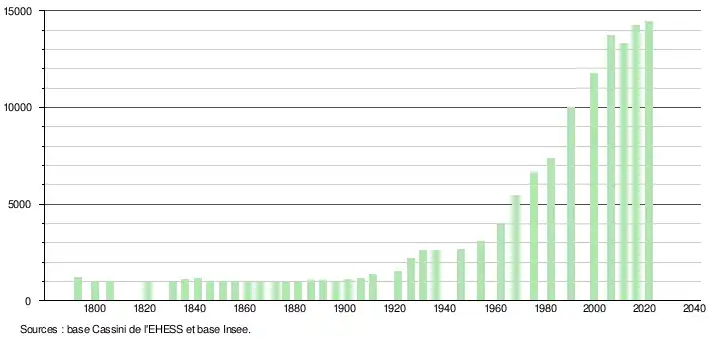 L'évolution du nombre d'habitants est connue à travers les recensements de la population effectués dans la commune depuis 1793. Pour les communes de plus de 10 000 habitants les recensements ont lieu chaque année à la suite d'une enquête par sondage auprès d'un échantillon d'adresses représentant 8 % de leurs logements, contrairement aux autres communes qui ont un recensement réel tous les cinq ans[22],[Note 3].