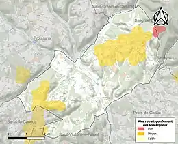 Les mouvements de terrains susceptibles de se produire sur la commune sont des tassements différentiels[40]. Le retrait-gonflement des sols argileux est susceptible d'engendrer des dommages importants aux bâtiments en cas d’alternance de périodes de sécheresse et de pluie[41]. 21,5 % de la superficie communale est en aléa moyen ou fort (58,6 % au niveau départemental et 48,5 % au niveau national métropolitain)[Carte 4]. Depuis le , en application de la loi ÉLAN, différentes contraintes s'imposent aux vendeurs, maîtres d'ouvrages ou constructeurs de biens situés dans une zone classée en aléa moyen ou fort[Note 6],[42].