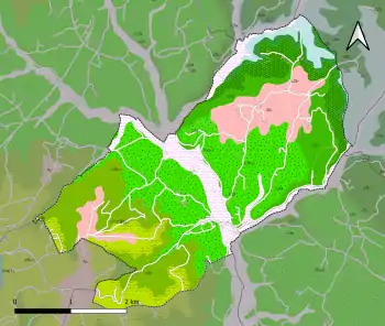 L'occupation des sols de la commune, telle qu'elle ressort de la base de données européenne d’occupation biophysique des sols Corine Land Cover (CLC), est marquée par l'importance des territoires agricoles (53 % en 2018), une proportion identique à celle de 1990 (53 %). La répartition détaillée en 2018 est la suivante : zones agricoles hétérogènes (46,9 %), forêts (45,2 %), terres arables (5,2 %), milieux à végétation arbustive et/ou herbacée (1,8 %), prairies (0,9 %)[34]. L'évolution de l’occupation des sols de la commune et de ses infrastructures peut être observée sur les différentes représentations cartographiques du territoire : la carte de Cassini (XVIIIe siècle), la carte d'état-major (1820-1866) et les cartes ou photos aériennes de l'IGN pour la période actuelle (1950 à aujourd'hui)[Carte 3].
