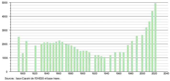 L'évolution du nombre d'habitants est connue à travers les recensements de la population effectués dans la commune depuis 1793. Pour les communes de moins de 10 000 habitants, une enquête de recensement portant sur toute la population est réalisée tous les cinq ans, les populations légales des années intermédiaires étant quant à elles estimées par interpolation ou extrapolation[20]. Pour la commune, le premier recensement exhaustif entrant dans le cadre du nouveau dispositif a été réalisé en 2006[21].