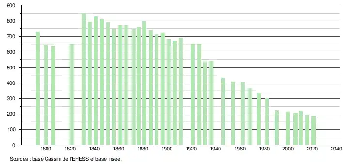 L'évolution du nombre d'habitants est connue à travers les recensements de la population effectués dans la commune depuis 1793. Pour les communes de moins de 10 000 habitants, une enquête de recensement portant sur toute la population est réalisée tous les cinq ans, les populations légales des années intermédiaires étant quant à elles estimées par interpolation ou extrapolation[17]. Pour la commune, le premier recensement exhaustif entrant dans le cadre du nouveau dispositif a été réalisé en 2005[18].