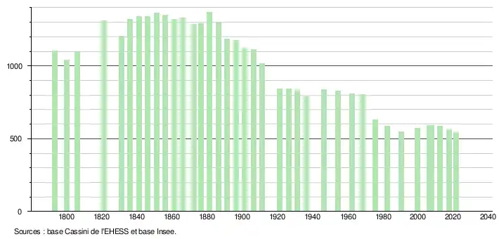 L'évolution du nombre d'habitants est connue à travers les recensements de la population effectués dans la commune depuis 1793. Pour les communes de moins de 10 000 habitants, une enquête de recensement portant sur toute la population est réalisée tous les cinq ans, les populations légales des années intermédiaires étant quant à elles estimées par interpolation ou extrapolation[24]. Pour la commune, le premier recensement exhaustif entrant dans le cadre du nouveau dispositif a été réalisé en 2007[25].