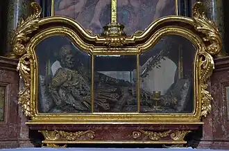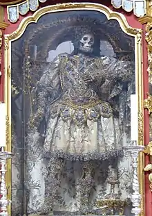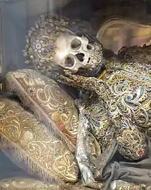 Les reliques ont entretemps été mises en scène, soit disposées dans un reliquaire, soit enchâssées dans une effigie de cire richement vêtue et dont émergent des éléments osseux authentiques (dents, portion de crâne, phalanges). L'effigie peut également figurer des marques de supplice rappelant les modalités supposées du martyre.
