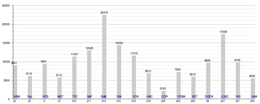| 9 | Nîmes Olympique | 33 | 34 | 15 | 1,065 |