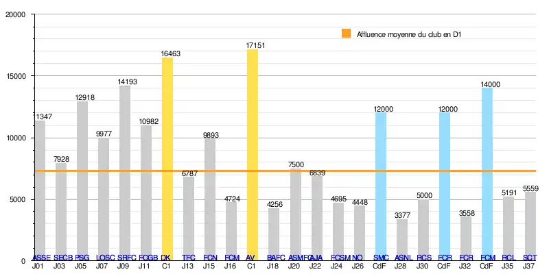 - de 139.172 spectateurs en 19 rencontres de Division 1, soit une moyenne de 7.325/match,