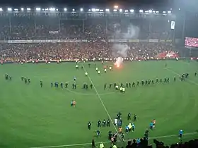 Lors de la finale de la Coupe de la Ligue, plusieurs dizaines de « supporters » parisiens déploient en début de deuxième mi-temps une banderole injurieuse envers toute la région Nord-Pas-de-Calais. La réaction est immédiate. Le Racing Club de Lens, la région, la LFP, la LICRA ainsi que d'autre associations, et même le club parisien portent plainte et saisissent la commission de discipline. Une enquête est ouverte[2], et le PSG est dans un premier temps sanctionné d'une non-participation en Coupe de la Ligue l'année suivante. Mais il sera finalement réintégré par le Tribunal administratif de Paris.