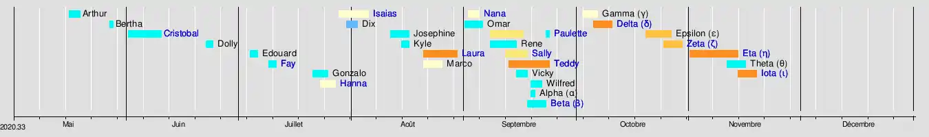 | Records de baptême hâtif d'une tempête durant la saison 2020[75],[76]. | ||||