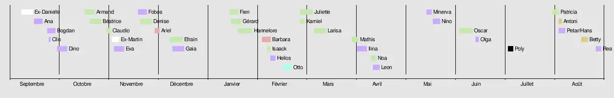 - en gras, les noms déjà attribués (p. ex. Ariel) ;
