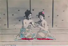La fabrication du saké de riz aurait été introduite de Chine au Japon peu après la riziculture, à la période Yayoi (IIIe siècle)[1] bien qu'une des premières mentions écrites sur cet alcool dans un texte chinois parle d'une boisson japonaise[2]. Cette fabrication se serait propagée d'ouest en est à partir de Kyūshū et Kinki[3]. Malgré ses origines probablement chinoises, le saké s’ancre au Japon par le shintoïsme et est inséparable de la riziculture. Le shintoïsme n’est pas basé sur des textes et n’a pas pour vocation le salut des êtres, mais est fondé sur des pratiques collectives tournées vers des éléments de la nature[4]. L'inoculation du ferment était des plus primitives, dite kuchikami (口噛み, « mâché dans la bouche »), les céréales cuites étant saccharifiées par la salive, et la fabrication du saké se disait kamosu, dérivé du verbe kamu (mâcher, mordre)[3].