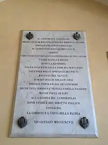 DES VILLES DE BOLOGNE FERRARE MODENE ET REGGIO JOINTES EN CE PALAIS LE VII JANVIER MDCCXCVII ORDONNA QUE L'ÉTENDARD TRICOLORE VERT BLANC ET ROUGE DEVIENNE UNIVERSEL DE LÀ LE DRAPEAU TÔT CÉLÉBRÉ PAR LA FOI DES PENSEURS SALUÉ PAR LES ESPOIRS DES POÈTES BAIGNÉ DANS LE SANG DES MARTYRS ET DES SOLDATS HÉROÏQUES TANTÔT PAR LE PEUPLE ET PAR LE ROI UNIS DÉCRÉTÉ SYMBOLE ET DRAPEAU DE LA NATION SE MEUT PLEINE D'HISTOIRES VERS LA GLOIRE DU CAPITOLE OÙ IL MONTRE LA LOI ITALIENNE CONSACRANT LA LIBERTÉ ET L'UNITÉ DE LA PATRIE
