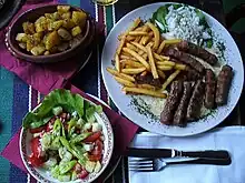 Un déjeuner serbe avec des patates, des ćevapi (à droite, avec des frites) et de la salade serbe (à gauche).