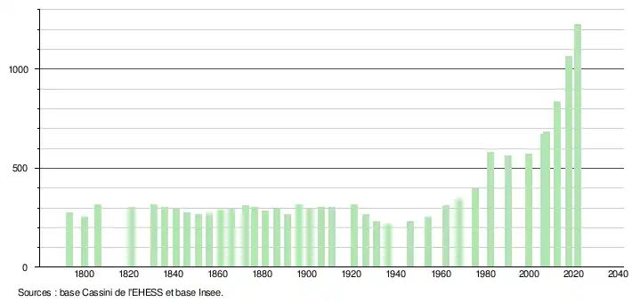 L'évolution du nombre d'habitants est connue à travers les recensements de la population effectués dans la commune depuis 1793. Pour les communes de moins de 10 000 habitants, une enquête de recensement portant sur toute la population est réalisée tous les cinq ans, les populations légales des années intermédiaires étant quant à elles estimées par interpolation ou extrapolation[22]. Pour la commune, le premier recensement exhaustif entrant dans le cadre du nouveau dispositif a été réalisé en 2007[23].