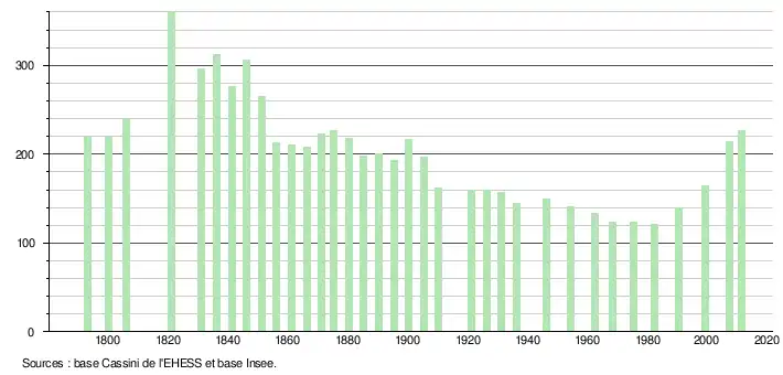 L'évolution du nombre d'habitants est connue à travers les recensements de la population effectués dans la commune depuis 1793. À partir du , les populations légales des communes sont publiées annuellement dans le cadre d'un recensement qui repose désormais sur une collecte d'information annuelle, concernant successivement tous les territoires communaux au cours d'une période de cinq ans. Pour les communes de moins de 10 000 habitants, une enquête de recensement portant sur toute la population est réalisée tous les cinq ans, les populations légales des années intermédiaires étant quant à elles estimées par interpolation ou extrapolation[2]. Pour la commune, le premier recensement exhaustif entrant dans le cadre du nouveau dispositif a été réalisé en 2007[3],[Note 1].