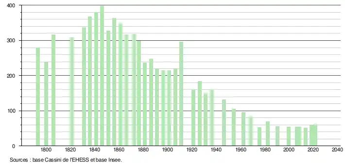 | L'évolution du nombre d'habitants est connue à travers les recensements de la population effectués dans la commune depuis 1793. Pour les communes de moins de 10 000 habitants, une enquête de recensement portant sur toute la population est réalisée tous les cinq ans, les populations légales des années intermédiaires étant quant à elles estimées par interpolation ou extrapolation[31]. Pour la commune, le premier recensement exhaustif entrant dans le cadre du nouveau dispositif a été réalisé en 2008[32]. En 2021, la commune comptait 61 habitants[Note 6], en augmentation de 15,09 % par rapport à 2015 (Haute-Garonne : +7,43 %, France hors Mayotte : +1,84 %). |