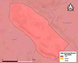 La commune est vulnérable au risque de mouvements de terrains constitué principalement du retrait-gonflement des sols argileux[24]. Cet aléa est susceptible d'engendrer des dommages importants aux bâtiments en cas d’alternance de périodes de sécheresse et de pluie. La totalité de la commune est en aléa moyen ou fort (76,3 % au niveau départemental et 48,5 % au niveau national). Sur les 323 bâtiments dénombrés sur la commune en 2019, 323 sont en aléa moyen ou fort, soit 100 %, à comparer aux 90 % au niveau départemental et 54 % au niveau national. Une cartographie de l'exposition du territoire national au retrait gonflement des sols argileux est disponible sur le site du BRGM[25],[Carte 3].