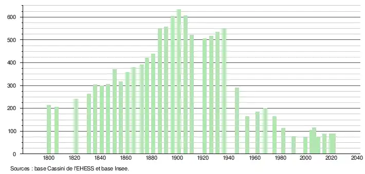 L'évolution du nombre d'habitants est connue à travers les recensements de la population effectués dans la commune depuis 1800. Pour les communes de moins de 10 000 habitants, une enquête de recensement portant sur toute la population est réalisée tous les cinq ans, les populations légales des années intermédiaires étant quant à elles estimées par interpolation ou extrapolation[7]. Pour la commune, le premier recensement exhaustif entrant dans le cadre du nouveau dispositif a été réalisé en 2004[8].