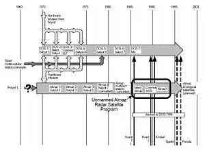 Mais le bureau d'études de Korolev est au milieu des années 1960 accaparé par le développement des missions lunaires et ses projets de station spatiale restent sans suite. En Union soviétique, contrairement aux États-Unis, l'activité spatiale en se développant a donné naissance à plusieurs entités concurrentes qui tentent d'imposer leurs projets spatiaux en utilisant leurs appuis dans l'appareil politique. Le rival le plus sérieux de Korolev, Vladimir Tchelomeï, qui entretient de bonnes relations avec les militaires, a proposé à ceux-ci de développer une station spatiale militaire occupée par un équipage de deux à trois cosmonautes et pouvant rester opérationnelle un à deux ans. Le système est complet : il comprend la fusée Proton, d'une capacité de lancement 20 tonnes en orbite basse, qui est un produit de son bureau d'études et qui doit placer dans l'espace la station spatiale baptisée Almaz (diamant en russe). Celle-ci est également désignée sous la référence OPS (ОПС, Орбитальная пилотируемая станция, Orbitalnaïa Pilotirouemaïa stanziïa pour « Station orbitale avec équipage »). L'ingénieur soviétique développe également un nouveau vaisseau, baptisé TKS, pour transporter l'équipage et le ravitaillement. Celui-ci lancé, par la fusée Proton, est près de trois fois plus lourd que le vaisseau Soyouz et dispose à la fois d'une grande capacité d'emport de fret et d'une capsule pouvant revenir sur Terre. La station Almaz emporte notamment un radar permettant d'obtenir des images de la surface terrestre, plusieurs caméras, deux capsules qui sont utilisées pour renvoyer des données au sol et un canon antiaérien chargé de défendre la station contre une attaque américaine. La commission interdépartementale donne son feu vert au projet en 1967. L'OKB-52 et sa branche no 1 se partagent la responsabilité du développement des vaisseaux[3],[4].