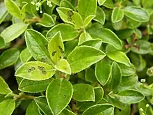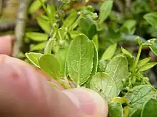 - Feuilles généralement ovales, jusqu'à 5 cm de long, 3 cm de large ; glabres et d'un vert brillant sur le dessus. D'abord fortement velues sur la face inférieure puis glabres, avec une bordure garnie de nombreuses petites dents émoussées.