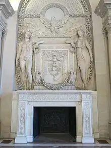Au fond de la salle se trouve une grande cheminée de style hétérogène. Le manteau de la cheminée date de la Renaissance mais provient d'un autre endroit non identifié du palais. Les deux grands personnages sont anciens mais d'origine indéterminée. Attribuées par erreur à Jean Goujon, elles ont été sévèrement restaurées en 1826 par Bernard Lange surnommé depuis l'ange exterminateur. Le reste, et notamment les aigles datent de l'époque napoléonienne. Le H a été ajouté ultérieurement à la place d'un N napoléonien et d'un buste de l'empereur [6].