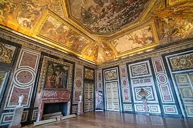 Le plafond a reçu un décor peint par Noël Coypel, provenant de l'ancien Cabinet d'angle (ou de Jupiter) de l'appartement du roi, situé à l'emplacement de l'actuel salon de la Guerre. La composition centrale représente Jupiter parcourant les airs, accompagné de la Justice, l'Abondance et la Piété. Les tableaux des voussures illustrent selon André Félibien : « deux des actions les plus mémorables de la Justice, et deux des actions les plus mémorables de la Piété dont l'Histoire a conservé la mémoire ». Ce sont des allusions aux qualités royales :