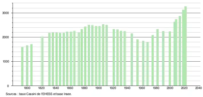 L'évolution du nombre d'habitants est connue à travers les recensements de la population effectués dans la commune depuis 1793. Pour les communes de moins de 10 000 habitants, une enquête de recensement portant sur toute la population est réalisée tous les cinq ans, les populations légales des années intermédiaires étant quant à elles estimées par interpolation ou extrapolation[24]. Pour la commune, le premier recensement exhaustif entrant dans le cadre du nouveau dispositif a été réalisé en 2008[25].