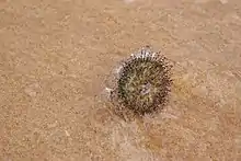 Ces oursins font partie des « oursins collecteurs » : ils portent souvent des objets (débris, algues) au-dessus d'eux pour se protéger.