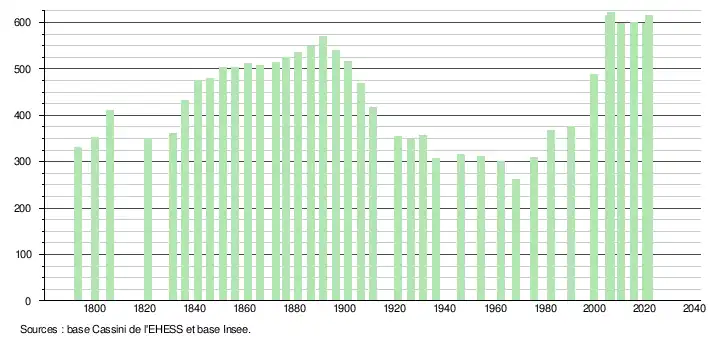 L'évolution du nombre d'habitants est connue à travers les recensements de la population effectués dans la commune depuis 1793. Pour les communes de moins de 10 000 habitants, une enquête de recensement portant sur toute la population est réalisée tous les cinq ans, les populations légales des années intermédiaires étant quant à elles estimées par interpolation ou extrapolation[15]. Pour la commune, le premier recensement exhaustif entrant dans le cadre du nouveau dispositif a été réalisé en 2005[16].