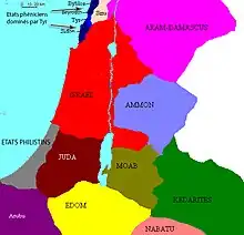 Les Israélites des environs de l'an 1000 av. J.-C. vivaient, semble-t-il, sur les hautes terres se trouvant à l'ouest du Jourdain, et un peu au-delà, sur le territoire de l'actuelle Jordanie. D'après la Bible, ils auraient été divisés en 12 tribus plus ou moins rivales, puis unifiés[6] vers l'an 1000 av. J.-C. par le roi Saül, puis par le roi David, et son fils Salomon.