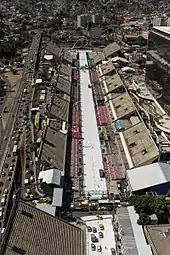 Vue aérienne du Sambodrome de Marques de Sapucaí avec la place de l'Apothéose à son extrémité en 2017.