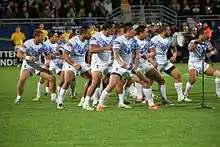 L'équipe des Samoa de rugby à XIII effectue la danse du Siva tau le 11 novembre 2013 à Perpignan (France) lors de la coupe du monde de rugby.