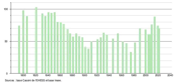 L'évolution du nombre d'habitants est connue à travers les recensements de la population effectués dans la commune depuis 1793. Pour les communes de moins de 10 000 habitants, une enquête de recensement portant sur toute la population est réalisée tous les cinq ans, les populations légales des années intermédiaires étant quant à elles estimées par interpolation ou extrapolation[18]. Pour la commune, le premier recensement exhaustif entrant dans le cadre du nouveau dispositif a été réalisé en 2004[19].