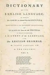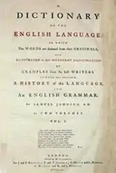 Pendant l'élaboration du dictionnaire, Johnson lance plusieurs souscriptions : les souscripteurs obtiendront un exemplaire de la première édition dès sa sortie en compensation de leur soutien ; ces appels durent jusqu'en 1752. Le Dictionnaire est finalement publié en , sa première page informant qu'Oxford a décerné à Johnson un diplôme par anticipation pour son œuvre[93]. Le dictionnaire est un ouvrage volumineux. Ses pages font près de 46 cm (18 pouces) de haut, et l'ouvrage fait 51 cm (20 pouces) de large quand on l'ouvre ; il contient 42 773 entrées, auxquelles très peu seulement seront ajoutées dans les éditions ultérieures. Il est vendu au prix exorbitant pour l'époque de 4 £ 10 s[N 6].
