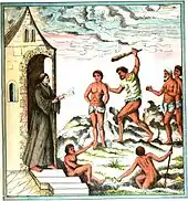 « L'ordre dont ils usent maintenant est qu'en chaque maison qui sont comme villages, il y a un prêtre qui les instruit ordinairement, ayant le prêtre un registre de noms et surnoms de tous les Indiens qui habitent au village sous sa charge. Il y a aussi un Indien qui est comme procureur du village, qui a un autre pareil registre, et le dimanche, quand le prêtre veut dire la messe, tous les dits Indiens sont tenus se présenter pour l'entendre, et avant que le prêtre la commence, il prend son registre, et les appelle tous par leur nom et surnom, et si quelqu'un fait défaut, il est marqué sur le dit registre; puis la messe dite, le prêtre donne charge à l'Indien qui sert de procureur de s'informer particulièrement où sont les défaillants, et qui les fasse réunir à l'église, où étant devant le dit prêtre, il leur demande l'occasion pour lequel ils ne sont pas venus au service divin, dont ils allèguent quelques excuses s'ils peuvent en trouver, et si elles ne sont trouvées véritables ou raisonnables, le dit prêtre commande au dit procureur Indien qui ait à donner hors l’église, devant tout le peuple, trente ou quarante coups de bâton aux défaillants. Voila l'ordre que l'on tient à les maintenir en la religion, en laquelle ils vivent partie pour crainte d'être battus : il est bien vrai que s'ils ont quelque juste occasion qui les empêche de venir à la messe, ils sont excusés. »