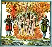 « Quant aux autres Indiens qui sont sous la domination du Roi d'Espagne, s'il n'y donnait ordre, ils seraient en aussi barbare croyance comme les autres. Au commencement de ses conquêtes, il avait établi l'inquisition entre eux, et les rendait esclaves ou faisait cruellement mourir en si grand nombre, que le récit seulement en fait pitié. Ce mauvais traitement était cause que les pauvres Indiens, pour l'appréhension de celui-ci, s'enfuyaient aux montagnes comme désespérés, et d'autant d’Espagnols qu'ils attrapaient, ils les mangeaient ; et pour cette occasion les dits Espagnols furent contraints leur ôter la dite inquisition, et leur donner liberté de leur personne, leur donnant une règle de vivre plus douce et tolérable, pour les faire venir à la connaissance de Dieu et la croyance de la sainte Église : car s'ils les voulaient encor châtier selon la rigueur de la dite inquisition, ils les feraient tous mourir par le feu. »