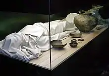 Au cours des fouilles archéologiques du sanctuaire, les archéologues sont tombés sur un cimetière de tumulus de l'époque du Hallstatt. Toutes les sépultures étaient entourées d'un fossé et surplombées d'un tertre. Plusieurs d'entre elles étaient couvertes d'un tumulus qui, par suite des aménagements ultérieurs, avait disparu ; seule exception, un caveau funéraire qui, bien qu'ayant été pillé, rapporta de nombreux indices. Les reconnaissances menées par la suite ont permis de caractériser cette tombe comme celle d'une femme celte de l'époque du Hallstatt de statut social élevé. On a retrouvé les objets personnels de la défunte comme des parures, des couverts et les restes d'une planche en bois ayant permis d'acheminer le corps. Les ossements, quoique dispersés, ont été presque entièrement retrouvés, certains d'entre eux brisés[17]. Les vestiges de la sépulture ont fait l'objet d'études tant dendrochronologiques qu'anthropologiques.