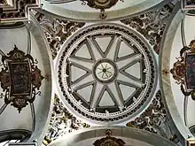 Sous le vitrail, juste au dessus de l'arche, se trouve une grande toile du peintre vénitien Giulio Carpioni (XVIIe siècle) commandée par l'ordre des marchands de Vicence après une grave famine : la Madone apparaissant au podestat Francesco Grimani. La toile de 1651 représente également une dédicace de gratitude au podestat Francesco Grimani, représenté à droite de la toile[18].